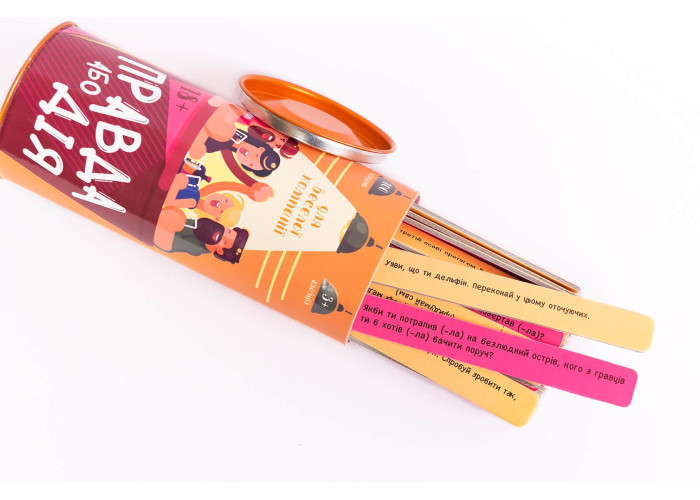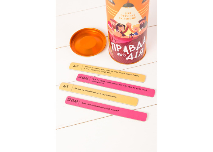 Стисло про правила: Ви по черзі питаєте один одного «Правда чи Дія?». Якщо вибрали «Дію» - тягніть стик і виконуйте завдання з його білого боку. «Правда» - вам необхідно відповісти на питання з рожевого боку.