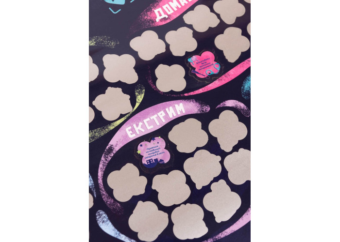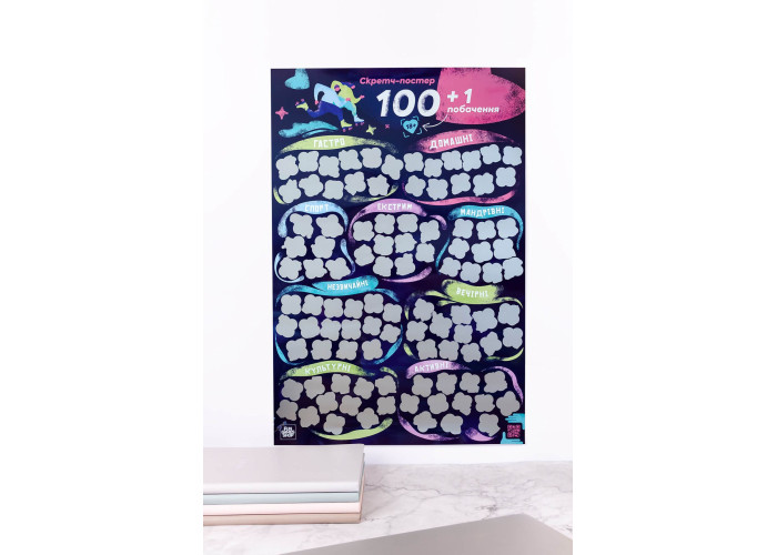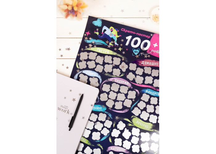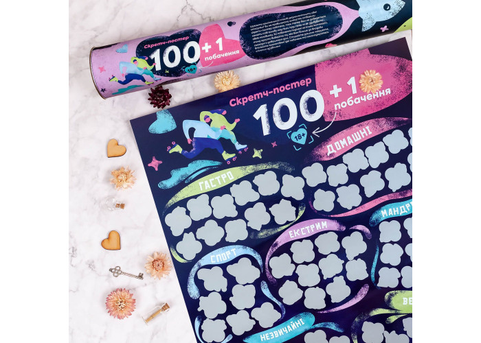 Опис: Якщо ви шукали спосіб доповнити або прикрасити свої стосунки, ви його знайшли. Ми створили для вас скретч-постер побачень. Тепер вам не потрібно «сушити» голову над тим, куди піти або як порадувати свою половинку ― ми про все подбали за вас. Усі побачення поділені на кілька категорій: просто виберіть, яка з них сьогодні вам більше до вподоби, а решту вже визначить випадок. Стирайте захисне покриття та насолоджуйтесь часом, проведеним разом!