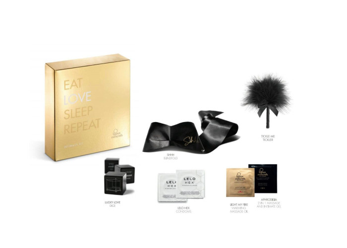 Подарунковий набір Bijoux Indiscrets INTIMACY LOVE спеціально розроблений для пар, які не соромляться своїх бажань та готові зробити перший крок у світ рольових ігор. Використовуйте широку атласну стрічку, щоб зав'язати партнерові очі. Зі щільною шовковистою маскою ваш обранець не зможе передбачати ваші дії, тому будь-який дотик до тіла сприйматиметься інтенсивніше, що в результаті призведе до надзвичайно яскравих відчуттів сексуального характеру. М'який матеріал та акуратно оброблені шви пов'язки не залишать слідів і не спричинять жодного дискомфорту. Оригінальний стильний пуховий пензлик стане прекрасним доповненням до ігор із заплющеними очима. Скористайтеся ним, щоб відчинити вашому партнеру двері до потоку нових відчуттів. Під час чуттєвої стимуляції або збуджувальних мануальних пестощів використовуйте силіконовий гель 2в1 або їстівну розігрівальну масажну олію. Обидва засоби ідеально підходять для масажу і як лубрикант, а природні афродизіаки в складі посилюють відчуття та загострюють насолоду. Завдяки спеціальним кубикам, ви можете здійснити всі ваші фантазії, навіть ті, про які боялися говорити. Просто підкиньте їх угору і випадок вирішить за вас, хто сьогодні зверху, а хто знизу. І ніколи не варто забувати про те, що секс має бути безпечним. Тому до набору входять два презервативи.