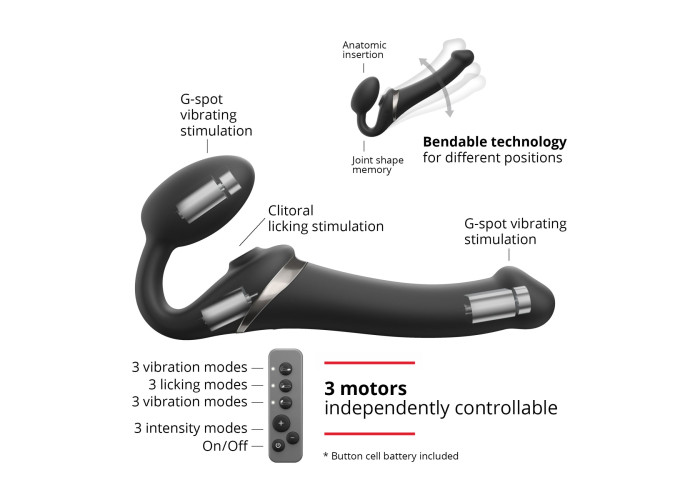 Пропонуємо купити безремінний вібрострапон з вакуумною стимуляцією Strap-On-Me MULTI ORGASM — унікальний страпон, який не тільки не потребує додаткового кріплення за допомогою трусиків або ременів, а ще й приносить неймовірне задоволення всім учасникам процесу. Тільки уявіть: ввідне яйце і стовбур вібрують, а частина, що прилягає до клітора, забезпечує вакуумну стимуляцію. Усі три мотори керуються автономно! Доступно по 3 режими вібрації та вакуумної стимуляції, плюс регулювання інтенсивності. Страпон утримується на місці завдяки надійній фіксації яйця всередині й ви можете точно підлаштувати його під себе за допомогою гнучких деталей. Повністю водонепроникний.