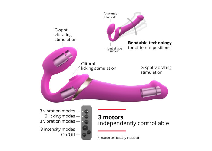 Пропонуємо купити безремінний вібрострапон з вакуумною стимуляцією Strap-On-Me MULTI ORGASM — унікальний страпон, який не тільки не потребує додаткового кріплення за допомогою трусиків або ременів, а ще й приносить неймовірне задоволення всім учасникам процесу. Тільки уявіть: ввідне яйце і стовбур вібрують, а частина, що прилягає до клітора, забезпечує вакуумну стимуляцію. Усі три мотори керуються автономно! Доступно по 3 режими вібрації та вакуумної стимуляції, плюс регулювання інтенсивності. Страпон утримується на місці завдяки надійній фіксації яйця всередині й ви можете точно підлаштувати його під себе за допомогою гнучких деталей. Повністю водонепроникний.