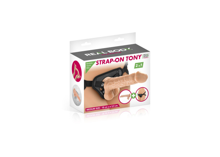 Жіночий страпон-трусики 2в1 Real Body — Tony — це секс-іграшка високої якості, яка допоможе здійснити багатьом парам найнеймовірніші еротичні фантазії. Ніжний, гнучкий, з великою головкою та яєчками, цей фалос подарує вам інтенсивну стимуляцію та численні оргазми, під час вагінального та анального сексу, з поясом та без. Потужна присоска в основі фалосу дасть можливість використовувати його без рук, просто прикріпивши до гладкої поверхні столу або на кахлі у ванній. Все залежить тільки від вашої фантазії, бажання і рівня збудження. Підходить для тих, хто хоче поринути у світ БДСМ чи пеггінгу, для одностатевих та гетеросексуальних пар. Матеріал штучного фалосу повністю гіпоалергенний, не пористий, без запаху та не містить фталатів. Діаметр фалосу 3,5 см, тому для новачків в анальному сексі його треба використовувати акуратно та з великою кількістю лубриканта. Трусики зручно регулюються за розміром завдяки двом ременям, не натирають, не заважають і надійно триматися на стегнах навіть під час найінтенсивніших рухів.