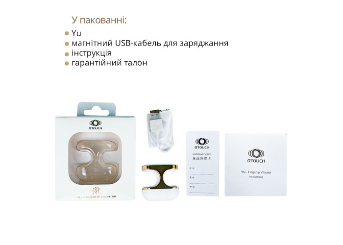 Вібратор на палець Otouch Yu — це чудова іграшка і для пар, і для самостійного використання. Ви можете використовувати сам вібратор для інтенсивних пестощів, або вібрувальні пальці для більш ніжних впливів. За вібратором легко доглядати: достатньо промивати теплою водою з нейтральним милом. У комплекті — магнітний USB-кабель для заряджання.