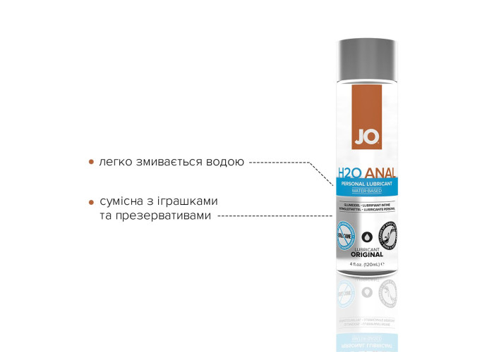 Анальний лубрикант на водній основі JO ANAL H2O — ORIGINAL (120 мл) — це інтимний лубрикант на водній основі, призначений для підвищення комфорту під час інтимної близькості. Містить гліцерин виключно рослинного походження, що забезпечує комфортне ковзання та інші високоякісні інгредієнти. Гладенька та оксамитова оліїста консистенція також забезпечує довготривале ковзання, не створюючи відчуття липкості. Лубрикант на водній основі JO ANAL H2O — ORIGINAL сумісний із сексуальними іграшками, з багатьма матеріалами, легко змивається.