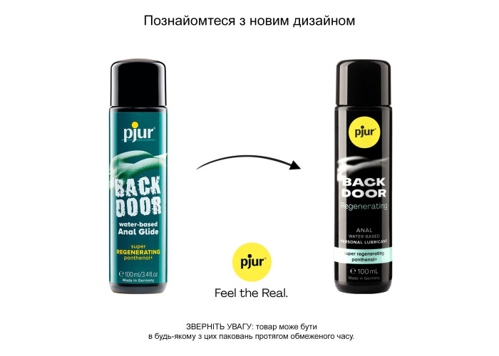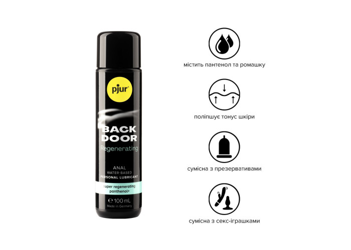 Лубрикант pjur Back Door Regenerating Anal Glide забезпечує тривале змащення, що робить його особливо придатним для боротьби з дискомфортними відчуттями під час анального сексу. Також підходить для використання з еротичними іграшками.