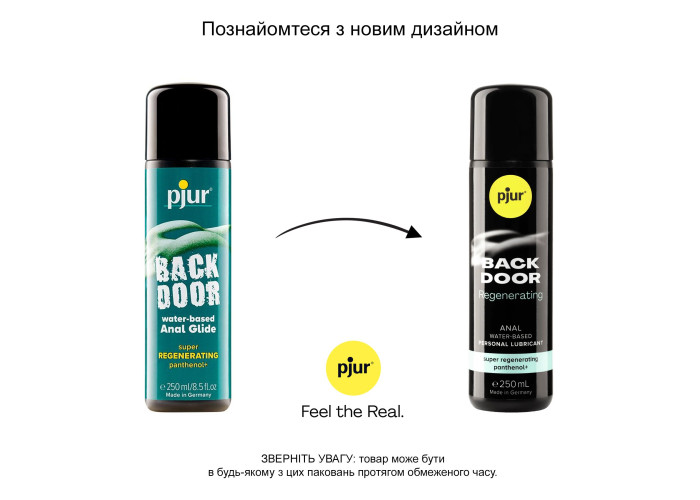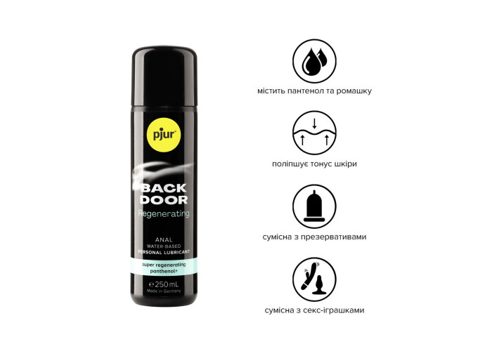 Лубрикант pjur Back Door Regenerating Anal Glide забезпечує тривале змащення, що робить його особливо придатним для боротьби з дискомфортними відчуттями під час анального сексу. Також підходить для використання з еротичними іграшками.