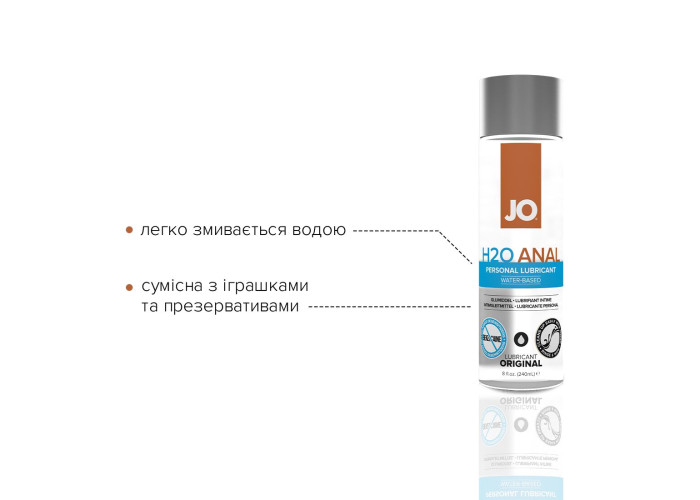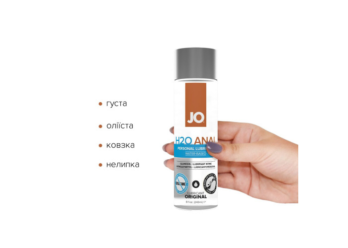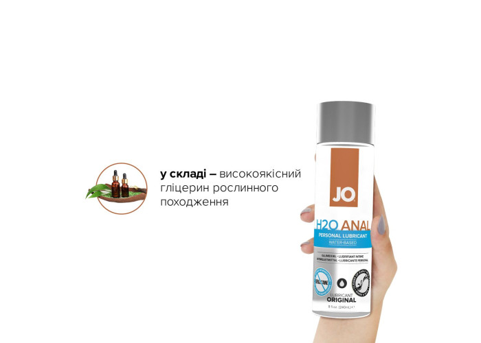 Анальний лубрикант на водній основі JO ANAL H2O — ORIGINAL (240 мл) — це інтимний лубрикант на водній основі, призначений для підвищення комфорту під час інтимної близькості. Містить гліцерин виключно рослинного походження, що забезпечує комфортне ковзання та інші високоякісні інгредієнти. Гладенька та оксамитова оліїста консистенція також забезпечує довготривале ковзання, не створюючи відчуття липкості. Лубрикант на водній основі JO ANAL H2O — ORIGINAL сумісний із сексуальними іграшками, з багатьма матеріалами, легко змивається.