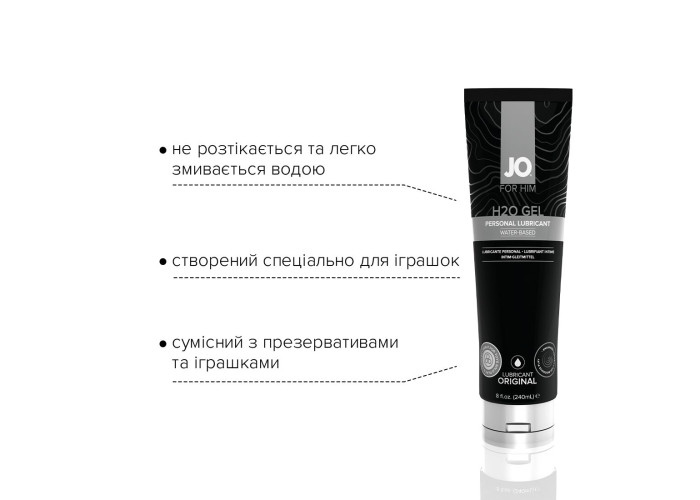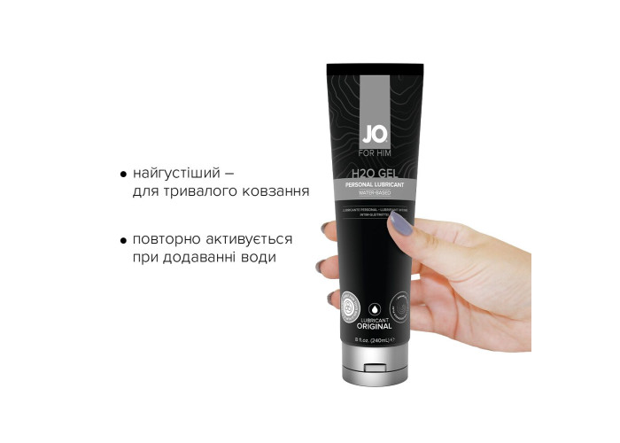 JO® H2O GEL ДЛЯ ЧОЛОВІКІВ — це інтимний лубрикант на водній основі, призначений для зволоження та підвищення сексуальної активності, особливо добре підходить для мастурбації. JO® H2O GEL ДЛЯ ЧОЛОВІКІВ виготовлений із використанням гліцерину виключно рослинного походження й має особливу густу консистенцію, що дарує абсолютно нові відчуття. Завдяки особливій гелеподібній текстурі лубрикант не розтікається, а залишається саме там, куди ви його нанесли, забезпечуючи тривале ковзання без липкості. Його формула розроблена спеціально для сексуальних іграшок, сумісна з багатьма матеріалами та легко змивається.