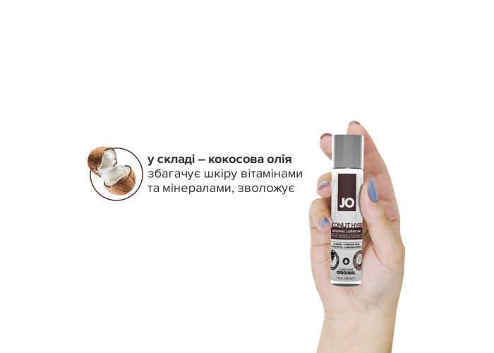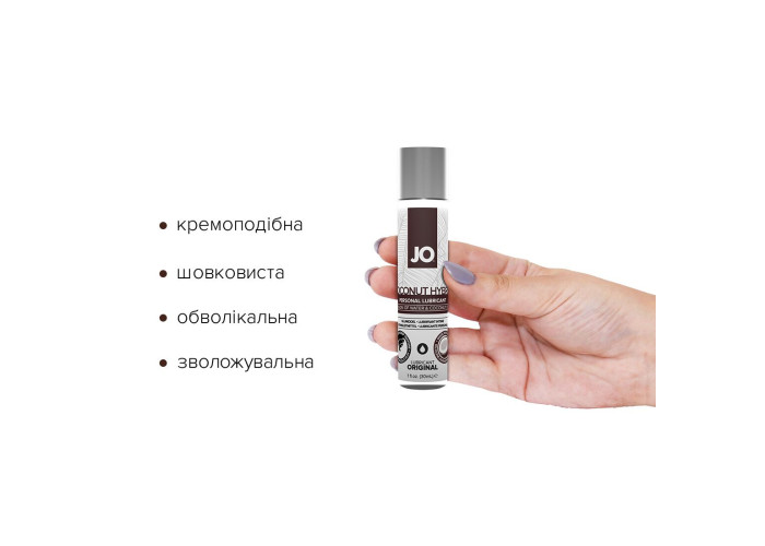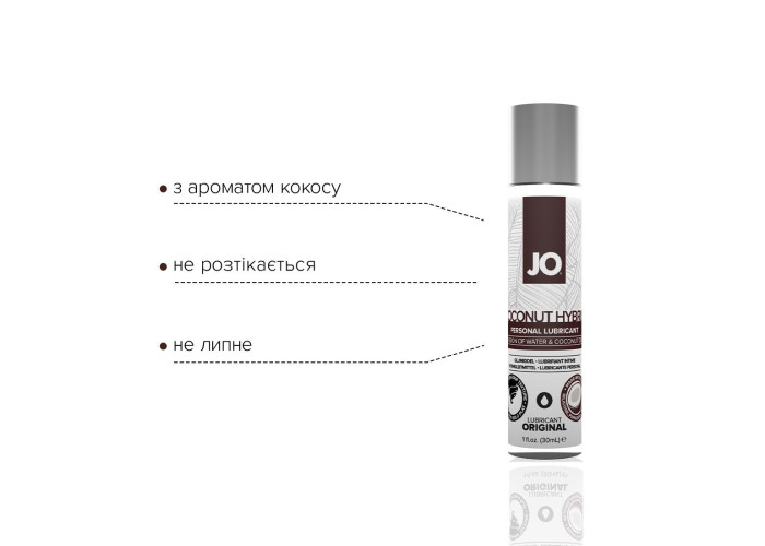Лубрикант на комбінованій основі JO Coconut Hybrid — ORIGINAL засіб, що не містить силікону JO® HYBRID. Це інтимний лубрикант, що використовується як доповнення до природної змазки. Ніжна гладенька текстура та вишуканий аромат кокосу чудово доповнюють атмосферу інтимності та усамітнення. До того ж цей розкішний кремоподібний білий лубрикант чудово підходить для трьох видів пестощів: самостійних, пестощів у парі та/або із застосуванням силіконових іграшок.
