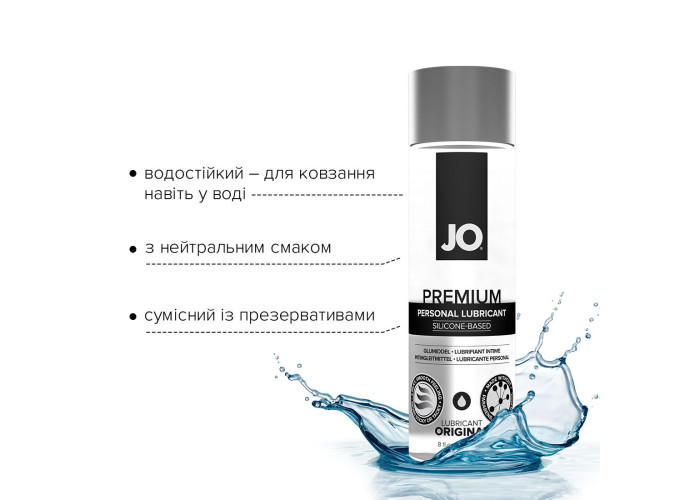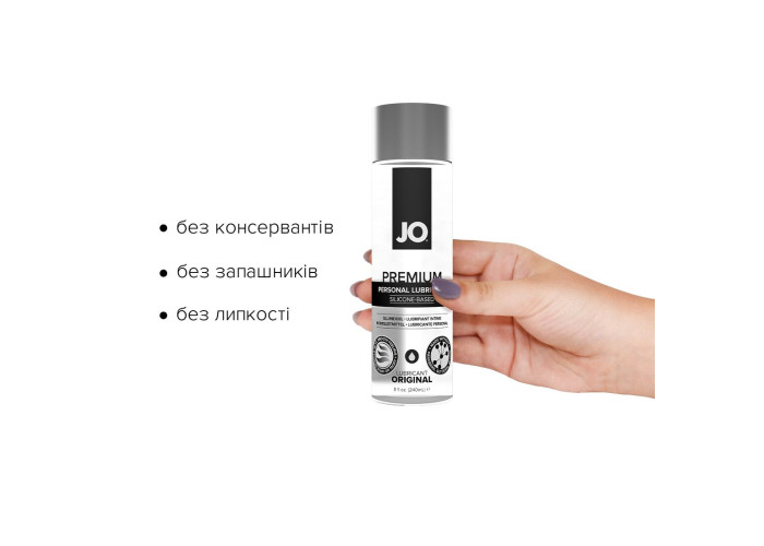 JO® PREMIUM — це інтимний лубрикант на основі силікону, що використовується як доповнення до природної змазки для отримання більшого задоволення від інтимної близькості. Забезпечує довге ніжне оліїсте ковзання, водостійкий, ідеально підходить для пестощів у нестандартних умовах. JO® PREMIUM не містить консервантів і виготовлений із застосуванням силікону лише найвищої якості. Невеликої кількості вистачає надовго!
