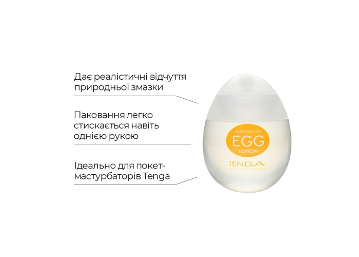 Бренд Tenga представляє ідеальну змазку для покет-мастурбаторів — лубрикант Tenga Egg Lotion. Паковання Egg Lotion дуже зручно використовувати однією рукою: достатньо легкого натискання — і змазку вже нанесено. Лубрикант виготовлений на водній основі, подовжує життя мастурбаторів і може використовуватися як з будь-якими іграшками, так і під час проникного сексу.