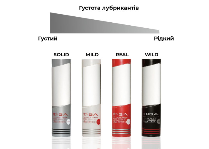Серія Tenga Hole Lotion представлена 4 лубрикантами з різною густотою. Найгустіший лубрикант серії — Solid, другий за густотою — Mild, максимально імітує природну змазку Real і найрідкіший у лінійці лубрикант носить назву Wild.