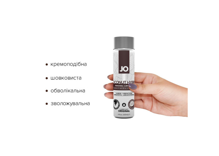 Рекомендуємо купити лубрикант із кокосовою олією JO Coconut HYBRID — ORIGINAL — унікальний продукт ніжного кремово-білого кольору, з густою консистенцією й чудовою текстурою. Ідеальне рішення як для пар, так і соло-ігор, і для силіконової іграшки (уточнюйте у виробника).