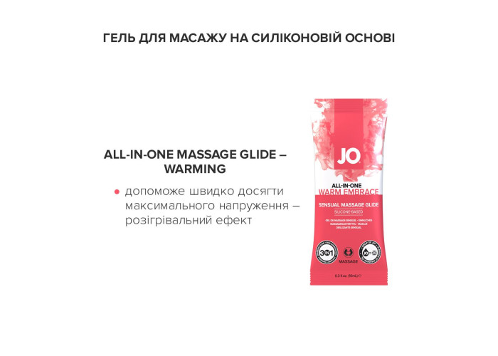 Гель для масажу на силіконовій основі JO ALL-IN-ONE MASSAGE GLIDE — WARMING допоможе швидко досягти максимального напруження пристрасті завдяки розігрівальному ефекту.