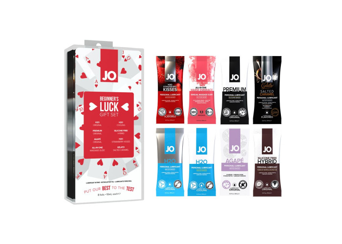 Ідея купити набір JO Beginner's Luck сподобається як поціновувачам експериментів, так і новачкам у використанні змазок. Сім типів змазок плюс гель для масажу, по 10 мл у кожному пакованні — цього точно вистачить на кілька разів, щоб обидва партнери встигли розпробувати кожен лубрикант і зрозуміти свої відчуття. Ви зможете оцінити особливості силіконових, водних та комбінованих лубрикантів, а також масажного розігрівального гелю.