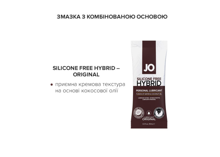 Лубрикант на комбінованій основі JO SILICONE FREE HYBRID — ORIGINAL — унікальне безсиліконове рішення на основі кокосової олії. Оригінальна змазка характеризується приємною кремовою текстурою й може використовуватися навіть з іграшками з різних матеріалів.