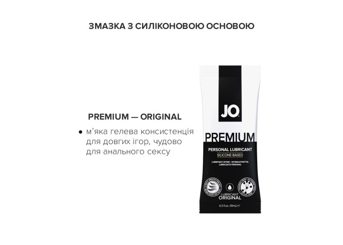 Лубрикант на силіконовій основі JO PREMIUM — ORIGINAL м’якої гелевої консистенції для довгих ігор та дуже легкого ковзання, чудово підходить для анального сексу.