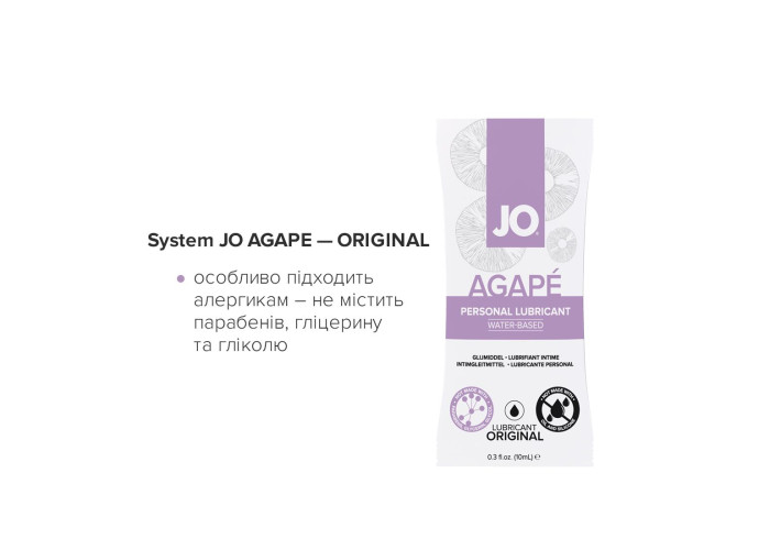Лубрикант на водній основі JO AGAPE — ORIGINAL підійде абсолютно всім, зокрема людям з алергією, оскільки не містить парабенів, гліцерину та гліколю, які зазвичай входять до складу змазок на водній основі.