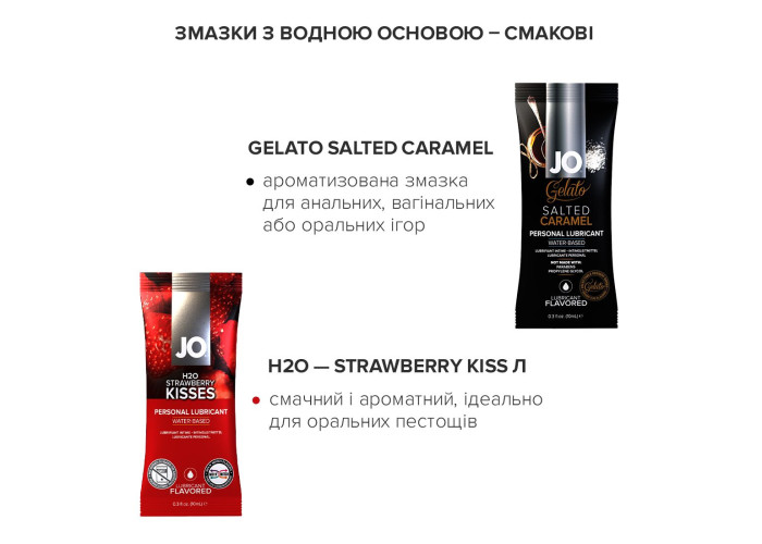 Лубрикант на водній основі JO GELATO SALTED CARAMEL (10 мл) — ще одна ароматизована змазка для різноманітних ігор, анальних, вагінальних або оральних.