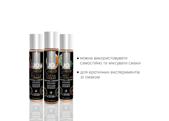 Набір складається з трьох популярних смакових змазок: солона карамель (JO Gelato Salted Caramel), крем-брюле (JO Gelato Creme Brulee) та м’ятний шоколад (JO Gelato Mint Chocolate).