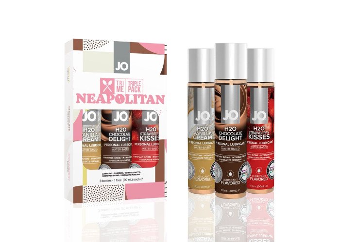 Для тих, хто любить експериментувати зі смаком під час орального сексу, рекомендуємо купити набір JO Tri-Me Triple Pack — Neapolitan. Приголомшливий коктейль зі спеціальних оральних гелів поєднує найпопулярніші смаки: темний шоколад, екзотичну ваніль і свіжу полуницю. Неаполітанська колекція ароматизованих лубрикантів, названа на честь морозива «Неаполітано», — це новий рівень чуттєвості від JO. Класичне неаполітанське морозиво — це різноколірний мікс із ванільного, шоколадного та полуничного морозива, смаком якого ви тепер можете насолоджуватися в ліжку з вашим партнером, під час найвідвертіших оральних пестощів.