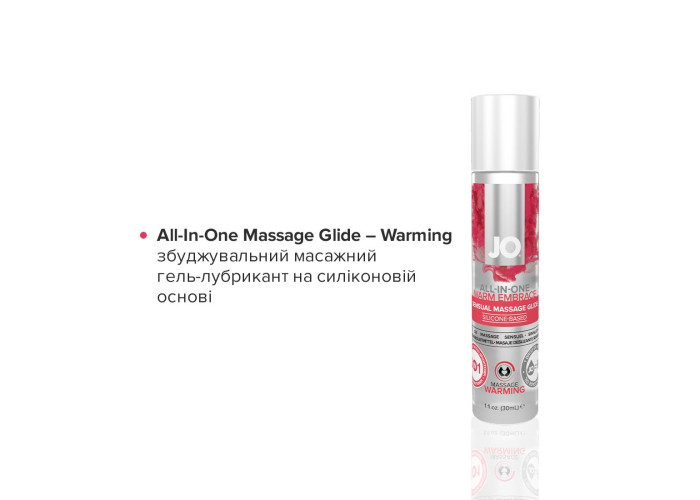 JO All-In-One Massage Glide — Warming — універсальний гель-змазка на силіконовій основі, що містить стимулювальні інгредієнти. Зігрівальні компоненти дарують додаткові приємні відчуття чуттєвого розслаблення. Гель-змазка має ідеальну консистенцію для масажу, оліїста структура без липкості та скочування створює неймовірну гладкість та шовковистість ковзання. А також робить нанесені на тіло татуювання яскравішими та зволожує шкіру. До складу гелю-змазки входить силікон найвищої якості.