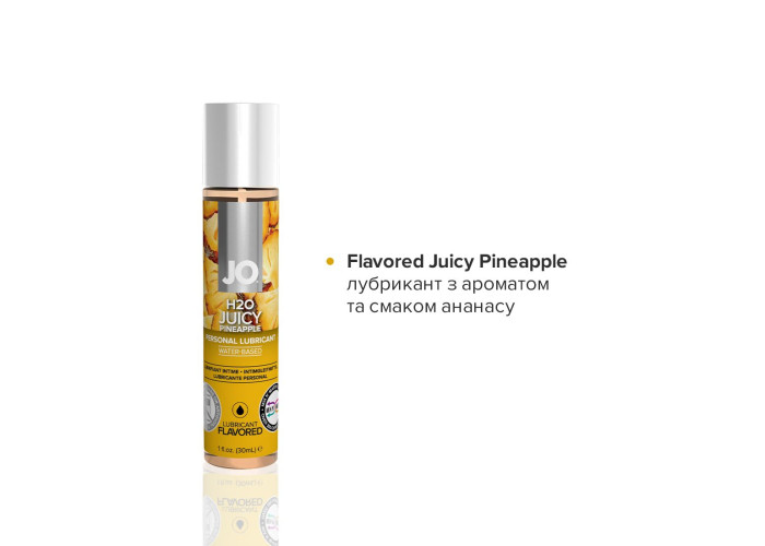 Jo Flavored Juicy Pineapple — pH-нейтральний інтимний лубрикант із насиченим ароматом ананаса. До складу входить гліцерин виключно рослинного походження. Усі інгредієнти найвищої якості та тільки натуральні харчові ароматизатори. У формулі лубриканту не міститься цукру, парабенів та пропіленгліколю. Забезпечує комфортне ніжне ковзання без липкості. Абсолютно безпечний для орального споживання, не має післясмаку.