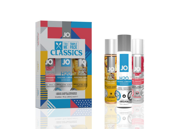 Набір складається з трьох популярних інтимних змазок: класична на водній основі (Jo H2O Original), збуджувальний масажний гель-лубрикант на силіконовій основі (JO All-In-One Massage Glide) — Warming, ароматизований лубрикант «соковитий ананас» (Jo Flavored Juicy Pineapple).
