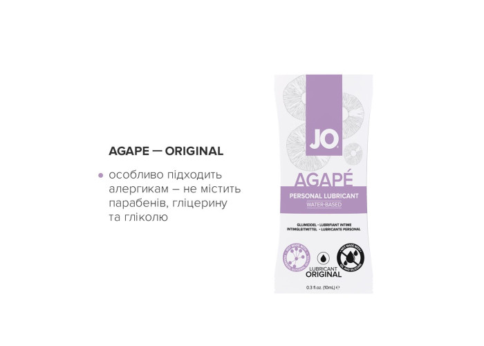 Склад JO Agapé Original: вода, пропандіол, глюконолактон, гідроксиетилцелюлоза, бензоат натрію, лимонна кислота.