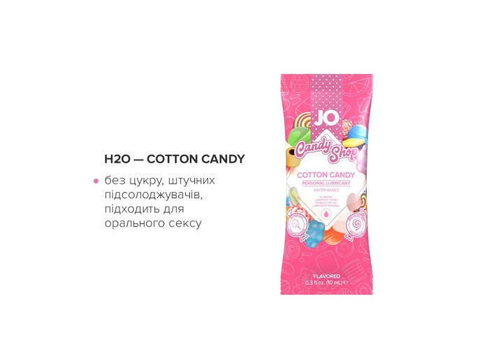 Склад JO H2O Cotton Candy: вода, гліцерин, гідроксиетилцелюлоза, сорбат калію, ароматизатор, хлорид натрію, сукралоза, лимонна кислота.