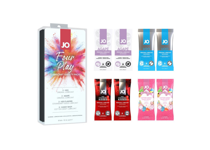 До набору змазок на водній основі JO Four Play входять 8 пакетиків лубрикантів по 10 мл. Одного пакетика вистачає одне застосування. До складу змазок входять лише гіпоалергенні, 100 % веганські інгредієнти натурального походження, які підходять для чутливої шкіри. Сет містить класичний лубрикант на водній основі без запаху на основі рослинного гліцерину, лубрикант без парабенів і гліколю, і два смакові лубриканти з найпопулярнішими смаками — полуниці та солодкої вати. Усі змазки добре всотуються і не залишають жирних плям на білизні. Використання лубрикантів гарантує тривале зволоження, збереження балансу природної змазки, догляд та приємне ковзання. Завдяки тому що змазки постачаються в одноразових стіках їх зручно брати із собою на побачення чи в поїздку.