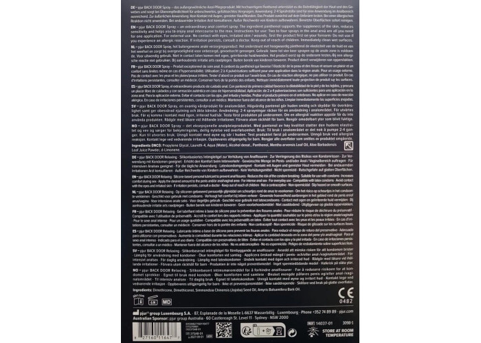 Склад pjur BACK DOOR Spray: Propylene Glycol, Laureth-4, Aqua (Water), Alcohol denat., Panthenol, Mentha arvensis Leaf Oil, Aloe Barbadensis Leaf Juice Powder, d-Limonene.