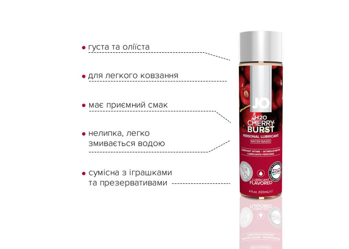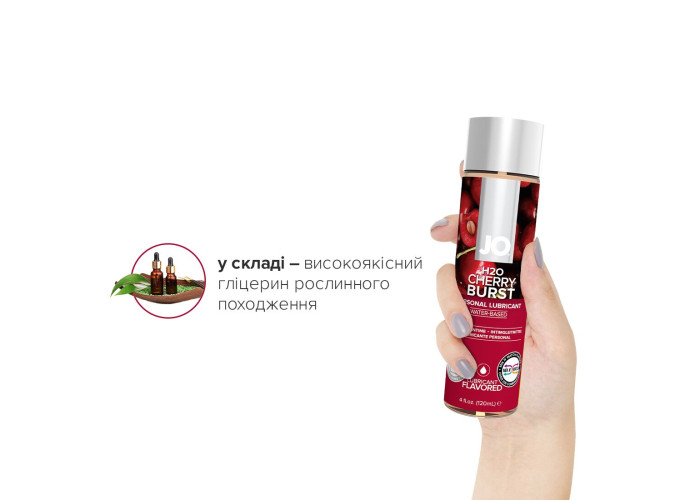 Якщо вам потрібна чиста змазка на водній основі та водночас із якимось цікавим смаком, рекомендуємо купити лубрикант на водній основі JO H2O — CHERRY BURST (120 мл). Створений на основі рослинного гліцерину, з натуральним ароматичним екстрактом та солодким смаком вишні, без цукру, він забезпечує яскраву прелюдію, незабутні оральні пестощі та тривале ковзання.
