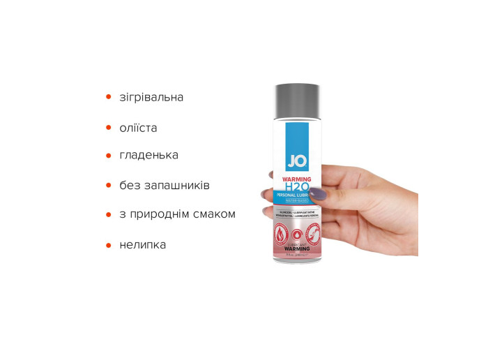 Змазка на водній основі JO H2O — WARMING — це інтимний лубрикант на водній основі, що використовується як доповнення до природної змазки. Виготовлений із використанням гліцерину виключно рослинного походження, цей лубрикант, що користується великою популярністю, забезпечує комфортне ніжне ковзання й не залишає відчуття липкості.