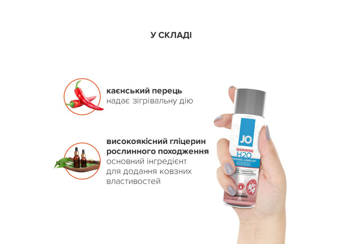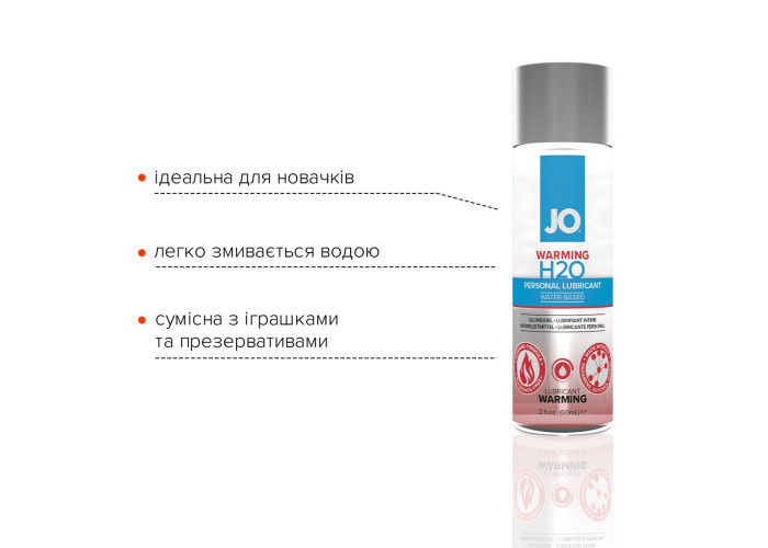Змазка на водній основі JO H2O — WARMING (60 мл) — це інтимний лубрикант на водній основі, що використовується як доповнення до природної змазки. Виготовлений із використанням гліцерину виключно рослинного походження, цей лубрикант, що користується великою популярністю, забезпечує комфортне ніжне ковзання й не залишає відчуття липкості.