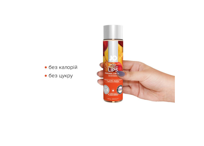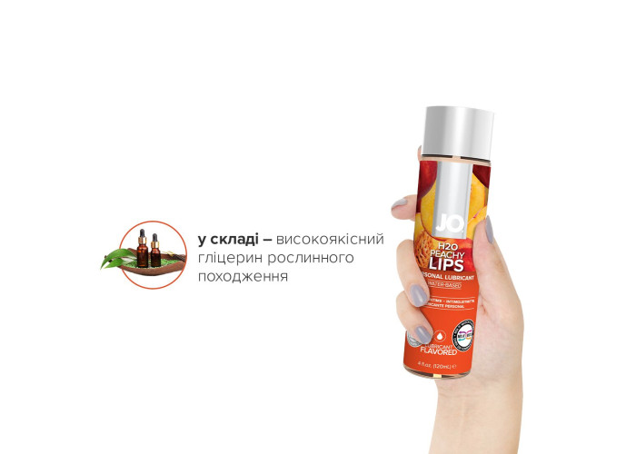 Лубрикант на водній основі JO H2O — PEACHY LIPS робить прелюдії більш приємними й поліпшує якість інтимної близькості. Виготовлений із використанням гліцерину виключно рослинного походження та натуральних ароматизаторів.