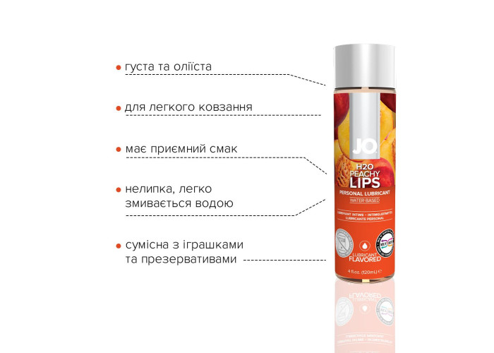 Лубрикант на водній основі JO H2O — PEACHY LIPS персикові губи — це інтимний лубрикант із широкою гамою насичених ароматів із колекції ароматизованих засобів JO® H2O.