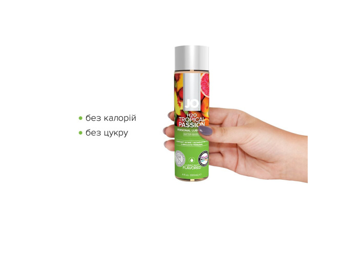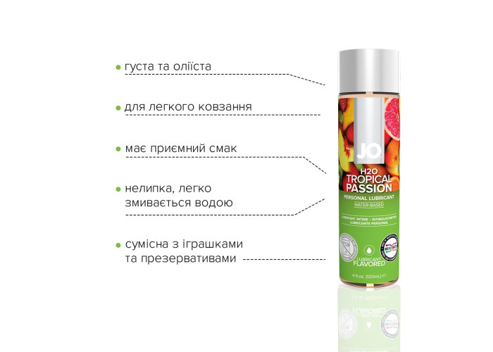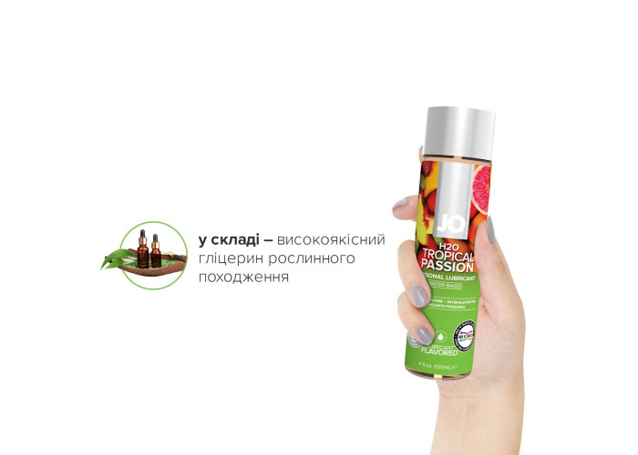 Якщо вам потрібна чиста змазка на водній основі та водночас із якимось цікавим смаком, рекомендуємо купити лубрикант на водній основі JO H2O — TROPICAL PASSION. Створений на основі рослинного гліцерину, з натуральним ароматичним екстрактом та солодким смаком тропічних фруктів, без цукру, він забезпечує яскраву прелюдію, незабутні оральні пестощі та тривале ковзання.
