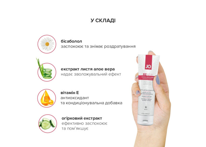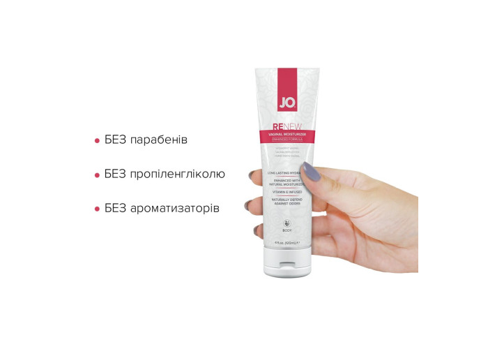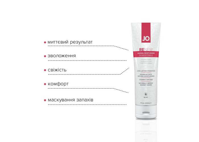 JO Renew — інтенсивно зволожувальний крем спеціально розроблений для жінок, що забезпечує тривалий комфорт без відчуття липкості. Поєднання зволожувальних речовин, включно з бісабололом, алое вера та екстрактом огірка, усуває сухість піхви та підтримує природну жіночу лубрикацію завдяки натуральним інгредієнтам, які знижують втрату вологи в ніжній інтимній зоні. Крем із густою ніжною текстурою не тече й підходить для застосування як вдень, так і вночі. У формулі крему не міститься парабенів, пропіленгліколю та ароматизаторів. Забезпечує миттєвий результат та комфорт. Без додавання гліцерину. Ідеально підходить для чутливої шкіри. Рекомендується застосовувати: під час менопауз, гормональної терапії, стресів, у разі дискомфорту через сухість піхви. Крем залишає на весь день відчуття свіжості та комфорту.