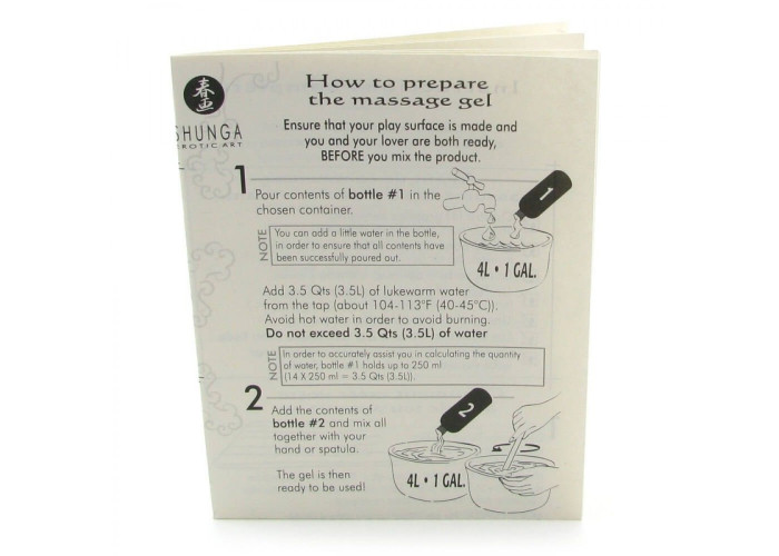 Для приготування суміші вам знадобиться 3,5 літри теплої води, з яких вийде 4 літри гелю. По черзі вилийте у воду обидва флакони з набору і добре перемішайте. Вуаля! Густий, неймовірно ароматний гель для кохання готовий. Скачайте 4 невисокі валики з ковдр або пледу і розподіліть по краях ліжка. Має вийти подоба невисоких бортів. Це потрібно для того, щоб під час процесу гель не розтікався, підтримуючи постійне ковзання. Поверх розстеліть золоте покривало і запрошуйте партнера випробувати незабутнє задоволення, яке запам'ятається вам надовго.