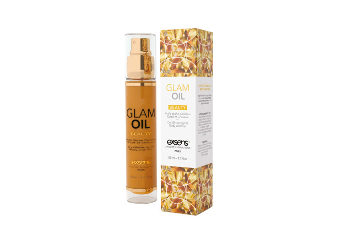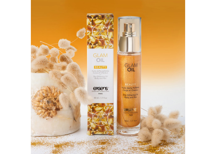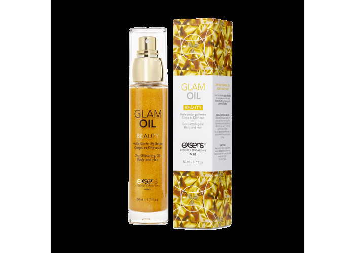 Розкішний золотистий блиск і досконалу шкіру можна отримати, якщо придбати олію для тіла з блиском Exsens Glam Oil. Екстракт мигдалевої олії забезпечує ефект догляду, а дрібні сяючі частинки покривають шкіру, вирівнюючи її і надаючи сяйва. Вишуканий пудровий аромат доповнює ефект.