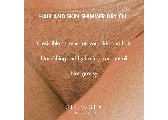 Ідеальний засіб, який подарує шкірі мерехтливий блиск, легкий аромат та шовковисте зволоження перед побаченням. Купуйте суху олію-шимер для волосся і тіла Bijoux Indiscrets Slow Sex, вона швидко всмоктується, залишаючи після себе ніжне мерехтіння, живить і доглядає за шкірою ерогенних зон.