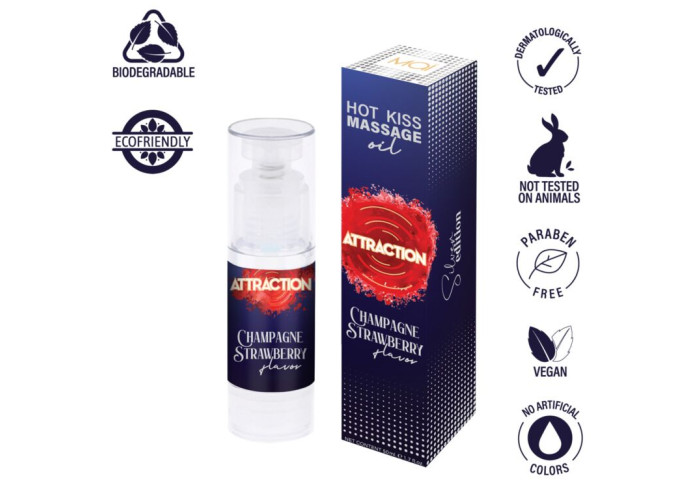 Їстівна масажна олія MAI Attraction Strawberry Hot Kiss – це завжди найкращий спосіб створити нові емоції. Приємна текстура олії забезпечує тривале ковзання, а гарячий ефект, у поєднанні зі збуджувальними властивостями афродизіаків, робить кожен дотик до шкіри унікальним, а оральний секс – по-справжньому апетитним. Ароматизована олія не містить цукру, парабенів і не має хімічного післясмаку. Формула олії повністю гіпоалергенна, підходить для чутливої шкіри та забезпечує їй шовковисту м'якість. Не рекомендується використовувати із латексними презервативами!