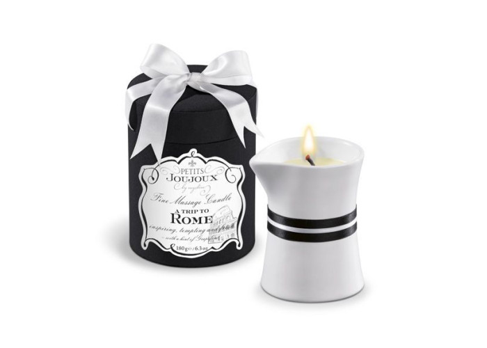 Пропонуємо купити масажну свічку Petits Joujoux - Rome - Grapefruit and Bergamott з яскравим ароматом грейпфрута та бергамота, який має підбадьорливу та збуджуючу дію. Просто уявіть: спекотне римське літо, запашний цитрусовий сад, пряний бергамот і повна свобода для незабутніх еротичних пригод.