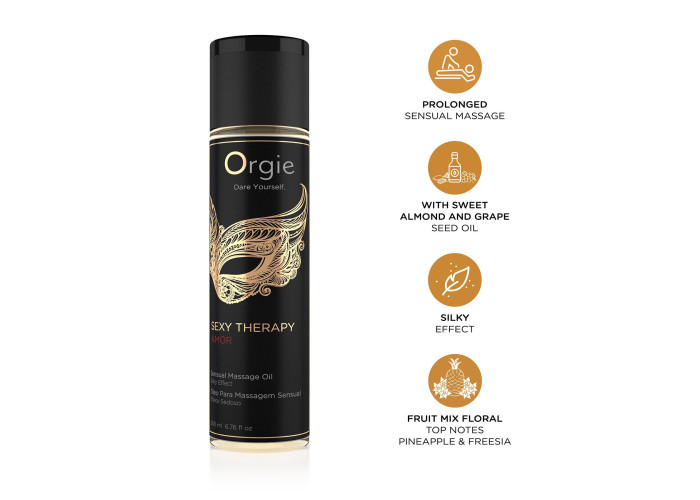 Пориньте в атмосферу справжньої насолоди та релаксу! Пропонуємо купити масажну олію Orgie – Sexy Therapy — гібридну мінеральну олію для тіла, збагачену цінними натуральними компонентами. Її унікальна формула поєднує в собі олії солодкого мигдалю та виноградних кісточок, які глибоко живлять і зволожують шкіру, надаючи їй шовковисту гладкість та здорове сяйво. Олія має витончений фруктово-квітковий аромат. Ніжність, догляд і чуттєвість у кожній краплі!