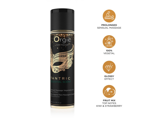 Тантричний масаж — це своєрідна медитація та найвища точка єднання, і добирати для нього аксесуари потрібно особливо ретельно. Для подібного таїнства рекомендуємо купити масажну олію Orgie – Tantric Celestial. Вона створена на основі цінних рослинних олій: олії виноградних кісточок, насіння соняшнику та арганової олії. Глибоко живить шкіру, тонізує її та зволожує. Олія ідеальна для чуттєвого масажу руками або власним тілом. Солодкий фруктовий аромат ківі та полуниці допомагає розслабитися та надовго залишається на шкірі.