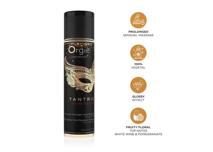 Тантричний масаж — це своєрідна медитація та найвища точка єднання, і добирати для нього аксесуари потрібно особливо ретельно. Для подібного таїнства рекомендуємо купити масажну олію Orgie – Tantric Divine Nectar. Вона створена на основі цінних рослинних олій: олії виноградних кісточок, насіння соняшнику та арганової олії. Глибоко живить шкіру, тонізує її та зволожує. Олія ідеальна для чуттєвого масажу руками або власним тілом. Вишуканий ніжний аромат білого вина та граната допомагає розслабитися та надовго залишається на шкірі.