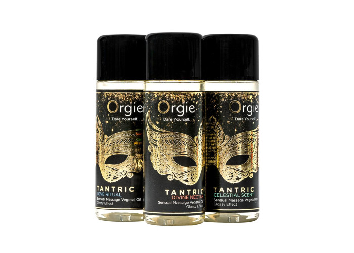 Пропонуємо купити набір олій для тантричного масажу Orgie – Tantric Mini Size Collection — чудову мініколекцію розкішних масажних олій, спеціально розроблених для чуттєвої інтимної медитації. У складі олій — натуральні інгредієнти, що зволожують і живлять шкіру, підвищують її пружність і гладкість. Олія виноградних кісточок є природним антиоксидантом, а арганова олія перешкоджає сухості та надає шкірі шовковистості. У колекції є відразу три олії: Celestial Scent — із запахом ківі та полуниці, Divine Nectar — з ароматом білого вина та граната, Love Ritual — з ароматом орхідеї та червоних ягід.