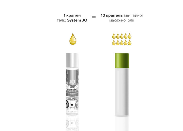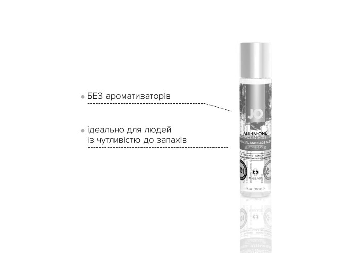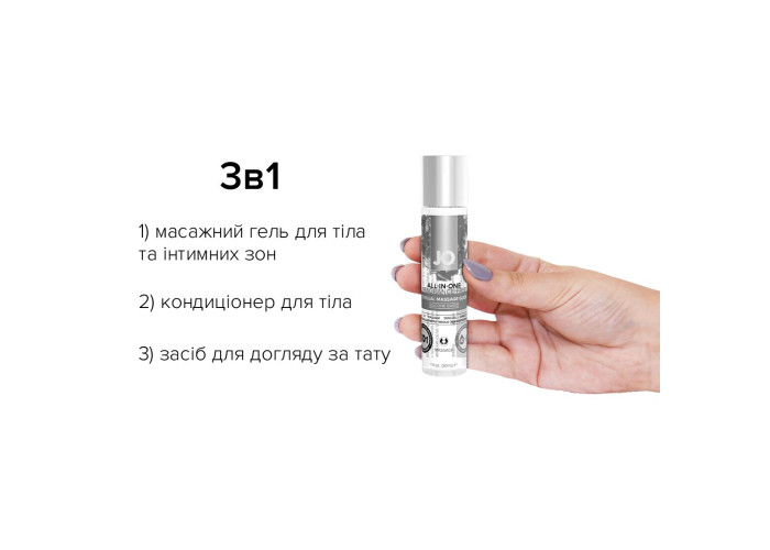 Гель для масажу на силіконовій основі JO ALL-IN-ONE MASSAGE GLIDE - SENSUAL (30 мл) - це полегшуюче ковзання засіб для масажу JO® ALL-IN-ONE. Виготовлений з використанням силікону тільки найвищої якості, гель для масажу на основі силіконової системи JO ALL-IN-ONE MASSAGE GLIDE - SENSUAL забезпечує казкові тактильні відчуття. Гладке шовковисте ковзання дозволяє робити масаж всього тіла без зайвих зусиль. Цей засіб для масажу на основі силікону також освітлює татуювання та надає на шкіру кондиціювання. Невеликої кількості вистачає надовго! Для людей із чутливістю до запахів.