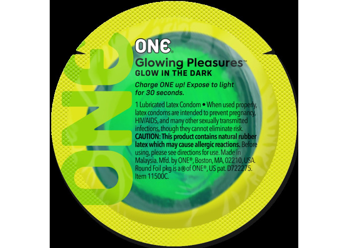 Пропонуємо купити презервативи ONE Glowing Pleasures — вони забезпечать вам не тільки максимально природне задоволення від інтиму, але й перетворять процес на незабутнє видовище. Особливість цих презервативів — здатність м’яко світитися в темряві завдяки особливому нетоксичному пігменту. Люмінесцентна речовина «запаяна» у внутрішньому шарі презерватива, тому не зітреться під час використання.